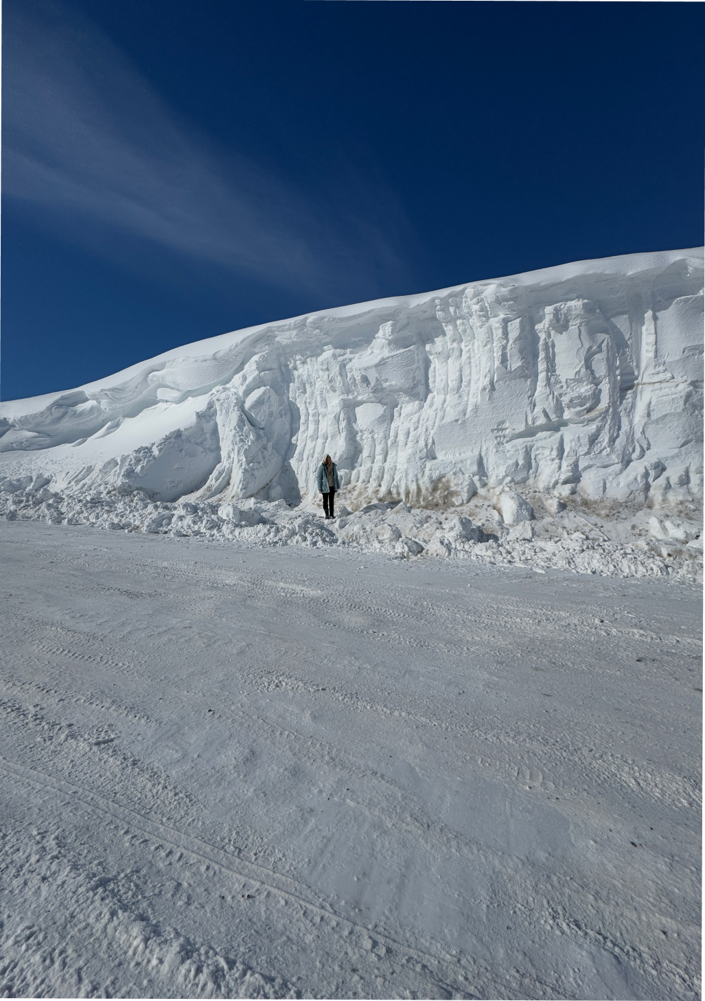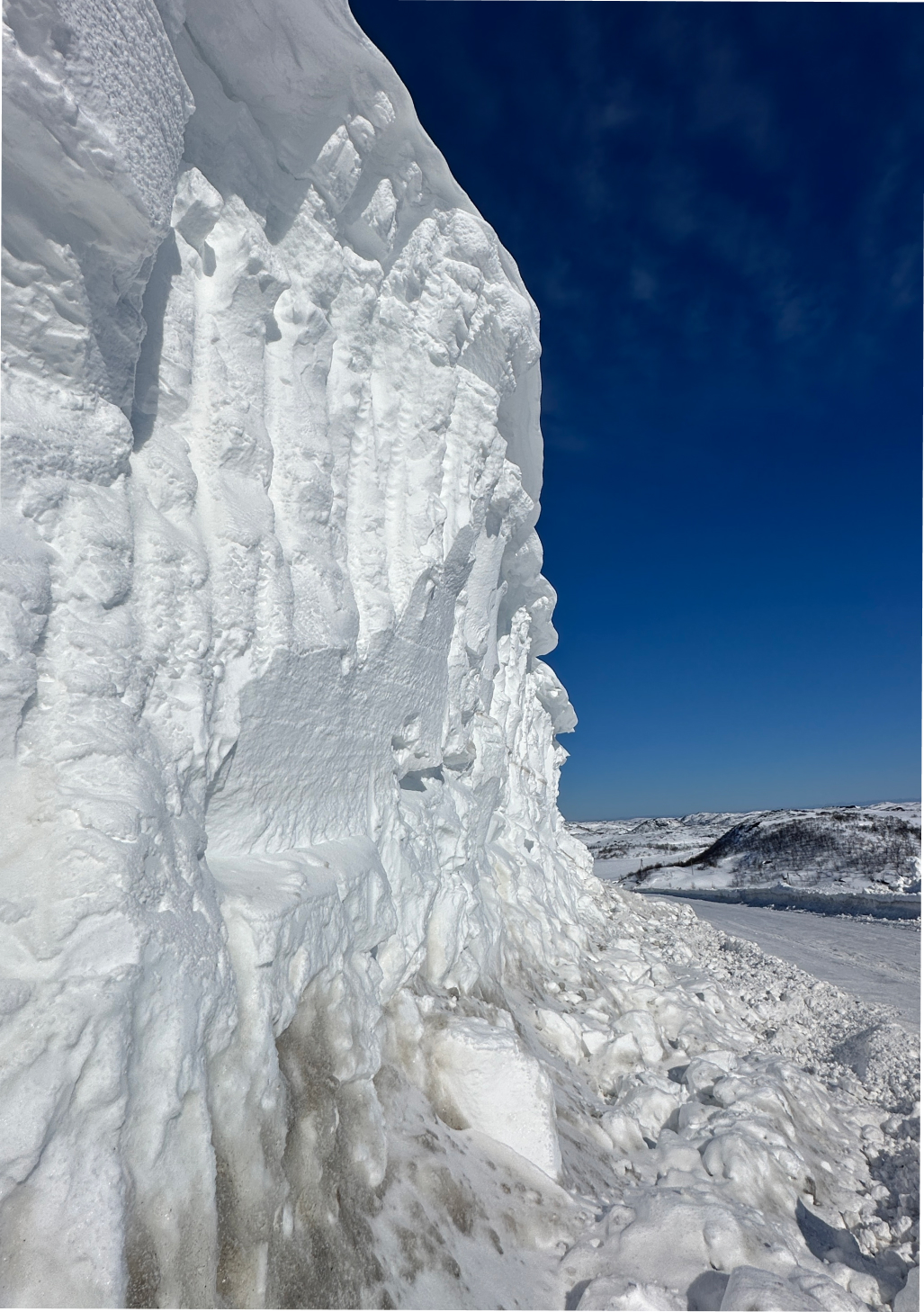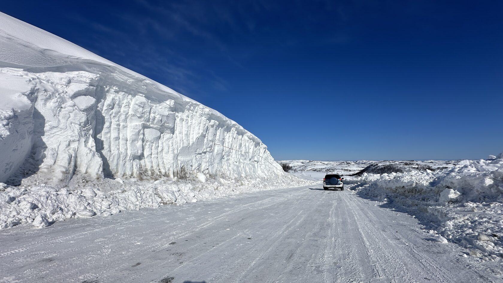 Сильно ли заметает дорогу в Териберку? Как видите, иногда очень сильно. В апреле-мае этот участок дороги становится поводом обязательной остановки для гостей. Оцените масштаб: машины и люди на фоне высоты сугроба кажутся миниатюрными.